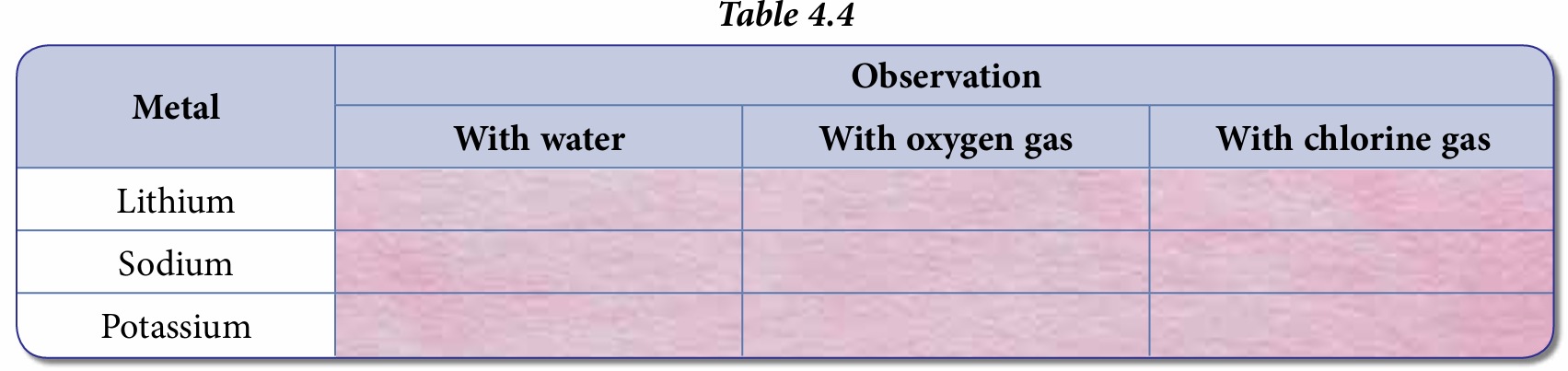 Materials: Lithium, sodium, potassium, distilled water, filter paper, red litmus paper, oxygen and chlorine gas