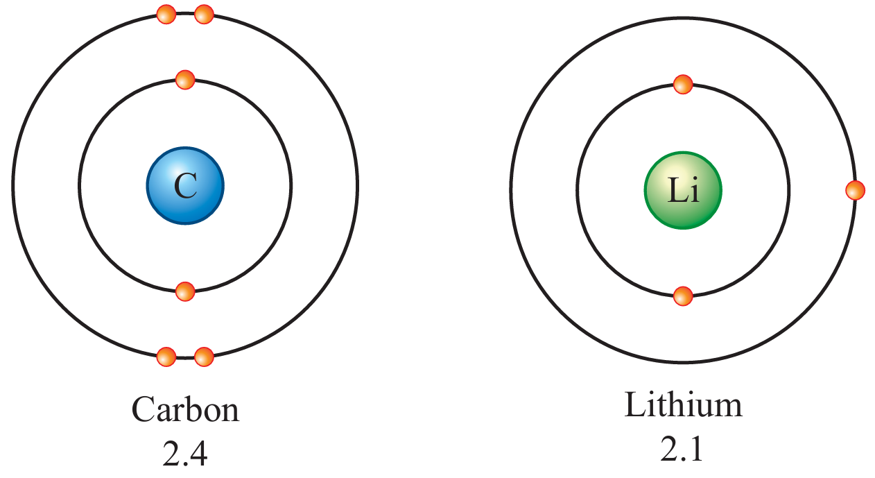 Draw the electron arrangements of lithium, Li and carbon, C.