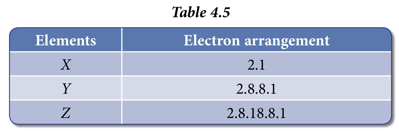 Table 4.5 shows the electron arrangement for elements X, Y and Z.