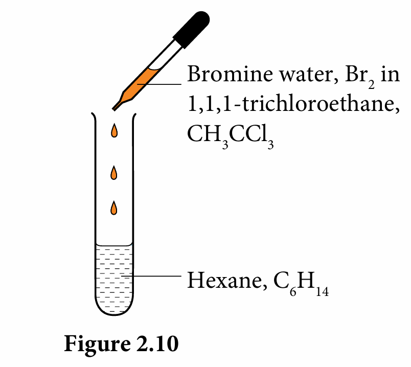 2. Add 2 – 3 drops of bromine water, Br2 in 1,1,1-trichloroethane, CH3CCl3 to hexane, C6H14 as shown in Figure 2.10.