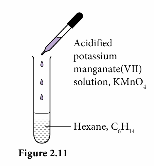 2. Add 2 – 3 drops of acidified potassium manganate(VII), KMnO4 solution to hexane, C6H14, as shown in Figure 2.11.