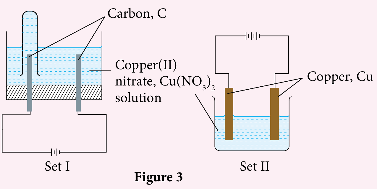 Figure 3 shows two sets of apparatus used to study the electrolysis of copper(II) nitrate solution.